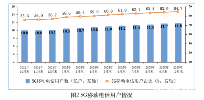 根据《2025年前10个月通信业经济运行情况》,截至2025年10月末,三家基础电信企业及中国广电的移动电话用户总数达18.3亿户,比上年末净增4015万户。其中,5G移动电话用户达11.84亿户,比上年末净增1.7亿户,占移动电话用户的64.7%。