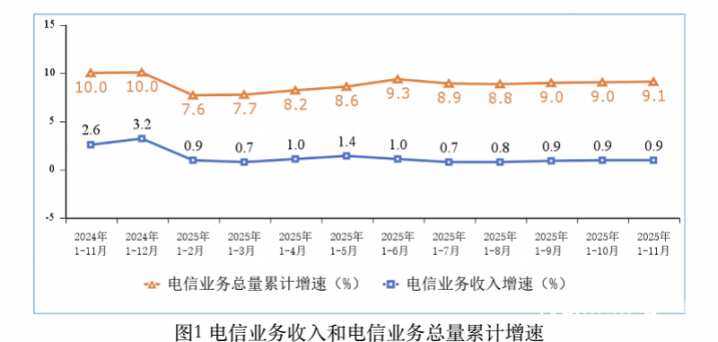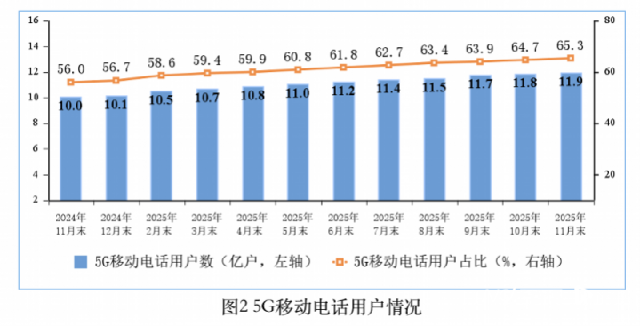 而《2025年前11个月通信业经济运行情况》则显示,截至11月末,三家基础电信企业及中国广电的移动电话用户总数达18.28亿户,比上年末净增3854万户。其中,5G移动电话用户达11.93亿户,比上年末净增1.79亿户,占移动电话用户的65.3%。